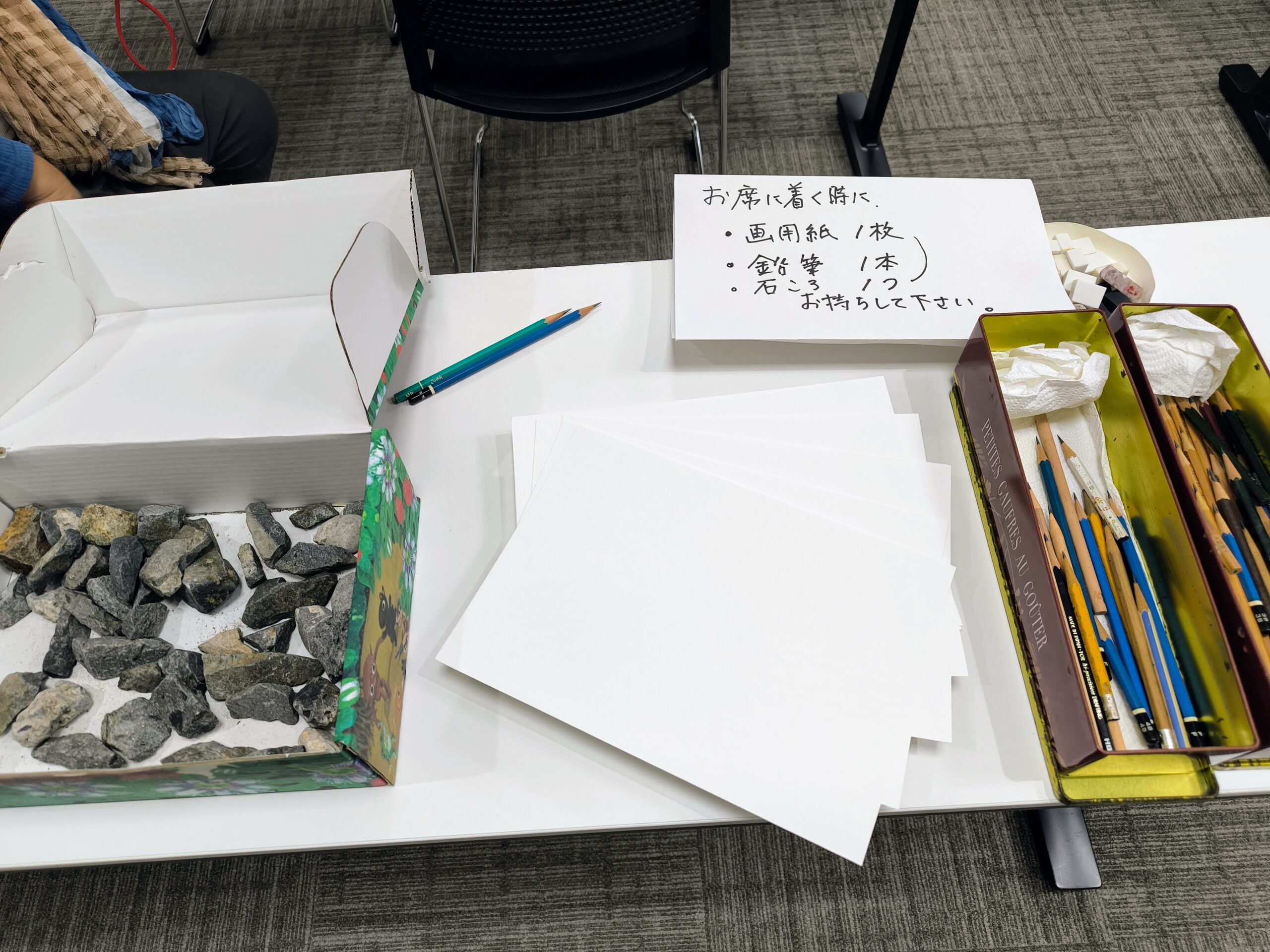 用意されたのは画用紙と、先生が準備してくださった奄美の草花、そして石。 「画用紙に水平線を一本引き、そこへ石を『立神』に見立てて描いてみましょう。そして、これらの草花を配置してみてください」 鈴木先生のその言葉で、会場は一瞬にして静寂に包まれました。